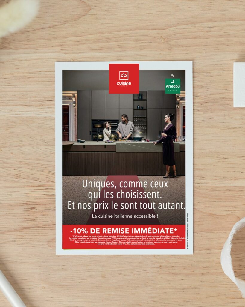 Création de supports print pour Cuisine Budget : un flyer destiné aux particuliers (B2C) et une plaquette commerciale pour les professionnels (B2B). Le design met en avant les offres, services et engagements de la marque, avec une approche claire et percutante adaptée à chaque cible.